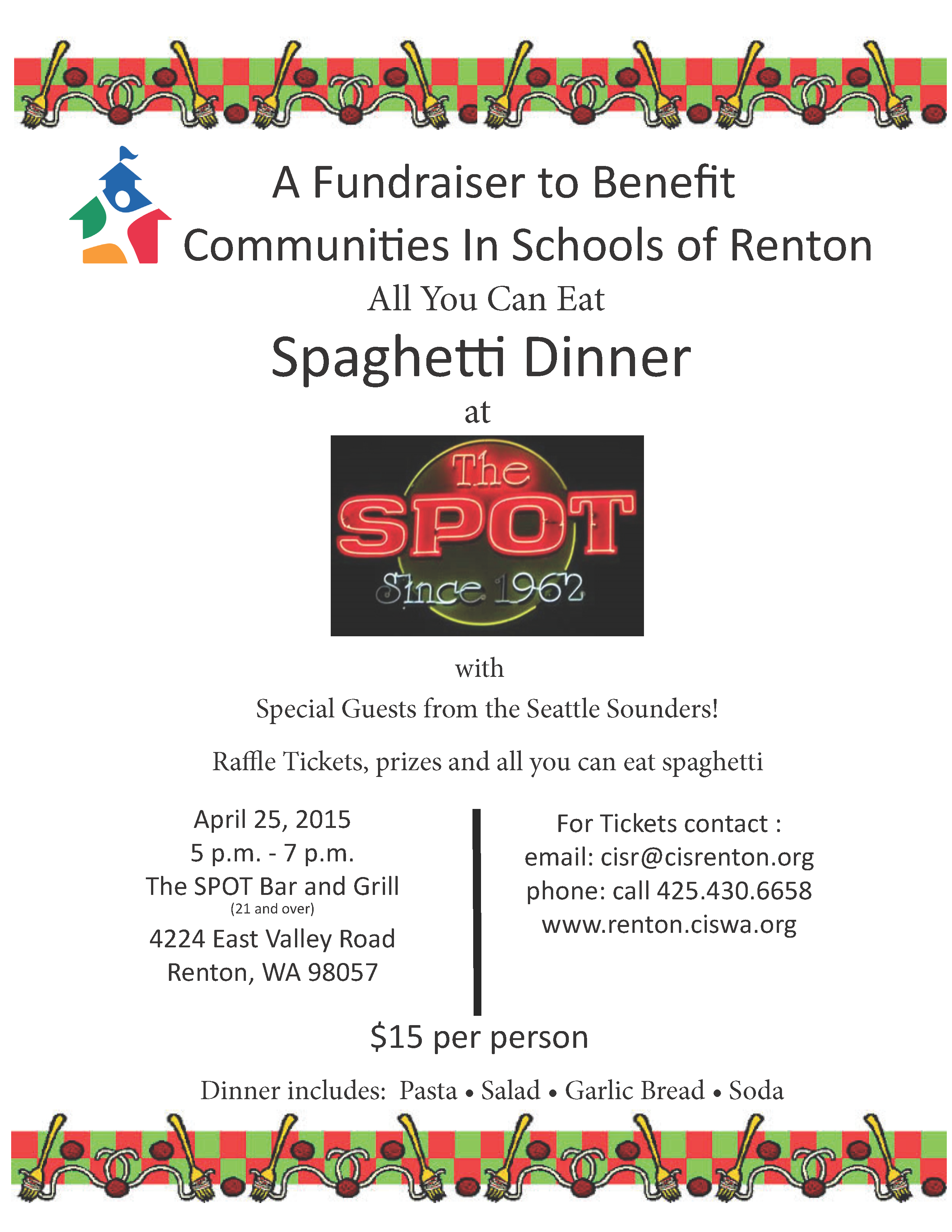 Spaghetti Dinner April 25, 2015 Posted on February 18, 2015 Come and join us for a fun filled evening with raffle tickets, prizes and all you can eat spaghetti! To purchase tickets or make a donation click here